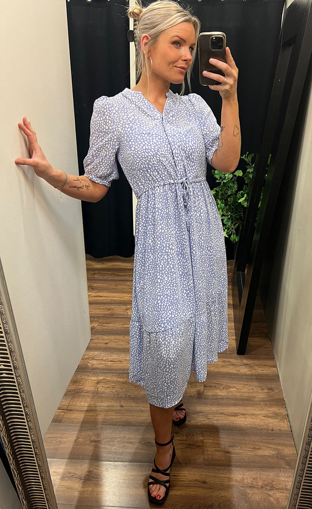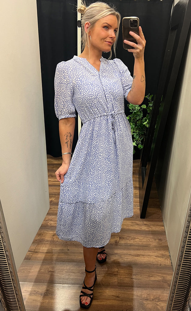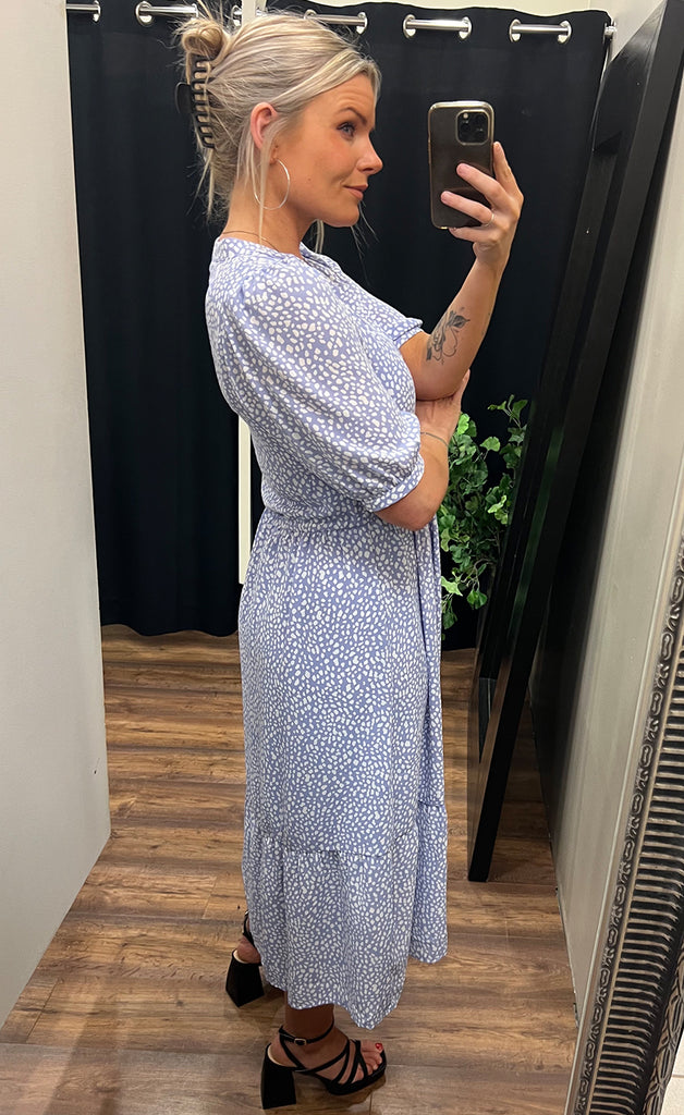 Ótrúlega fallegur kjóll frá danska merkinu Moss Copenhagen. Kjóllinn er hnepptur að ofan, rykktur í mittið og með víðu pilsi. -Módel notar stærð 36/38 og er í stærð XS