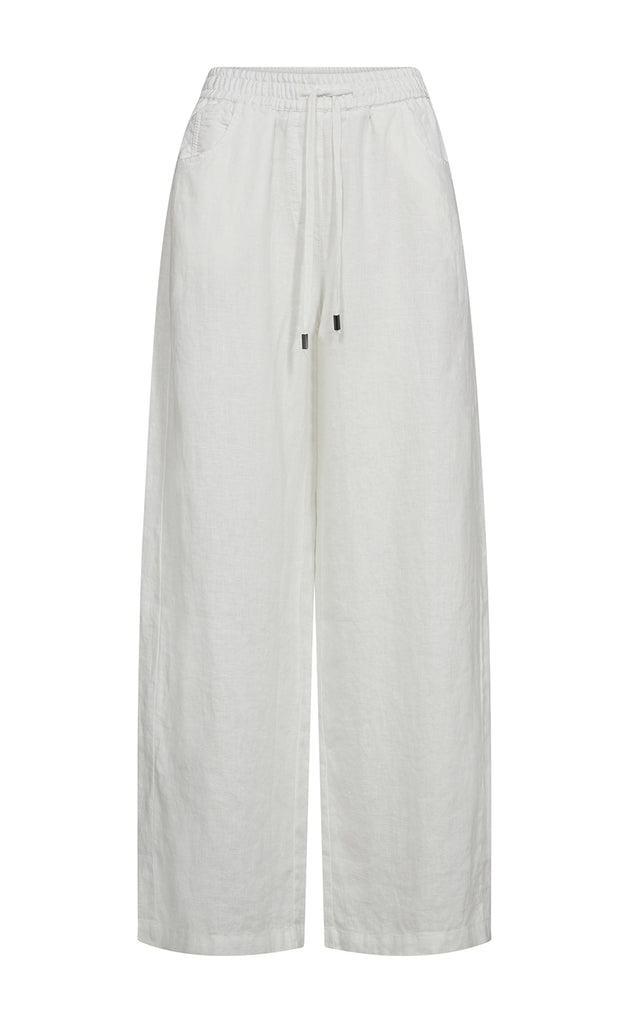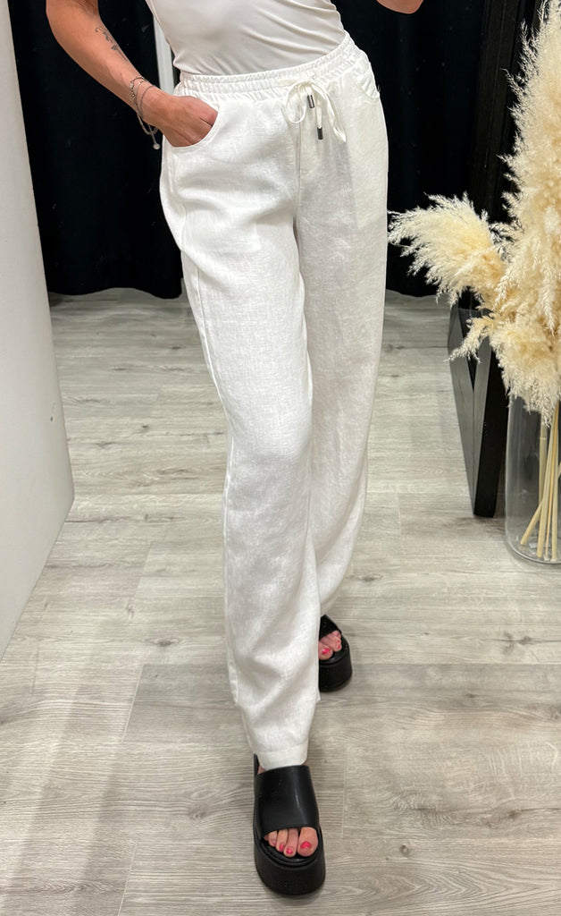 Ótrúlega flottar hör buxur frá danska merkinu NÜ. Buxurnar eru með teygju í strenginn, með vösum og víðar niður. -Módel notar stærð 36/38 og er 168 cm á hæð og er í stærð S