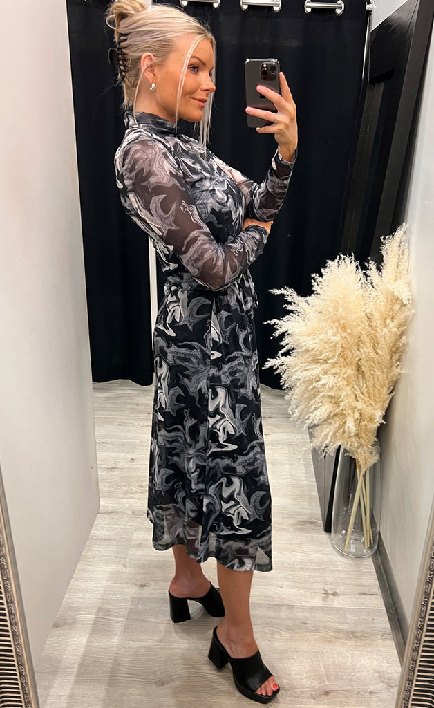 Kjóllinn er úr teygjanlegu mesh efni, með rúllukraga og hægt að taka saman í mittið með bandi.