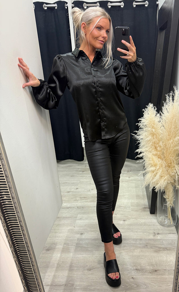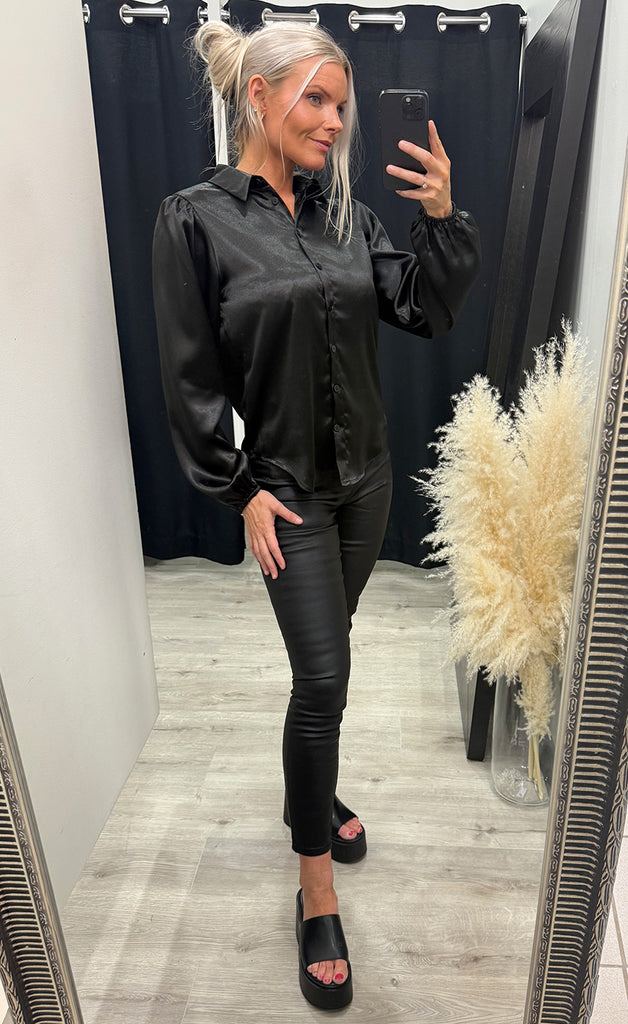Ótrúlega falleg satín skyrta frá danska merkinu Sisters Point. Skyrtan er með kraga, hneppt niður og úr flottu satín efni. -Módel notar stærð 36/38 og er 168 cm á hæð og er í stærð XS