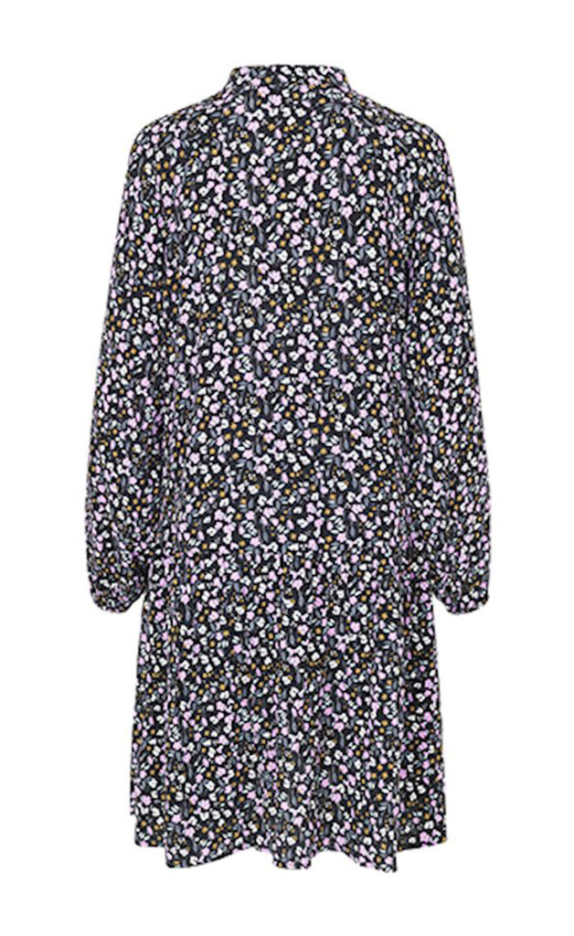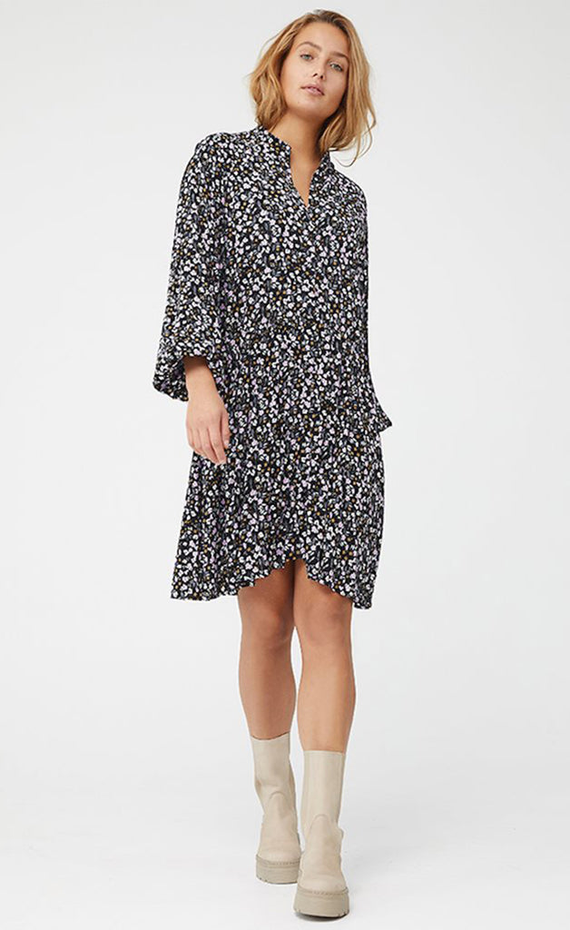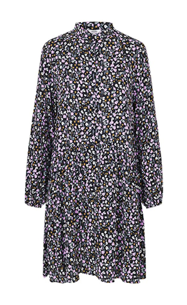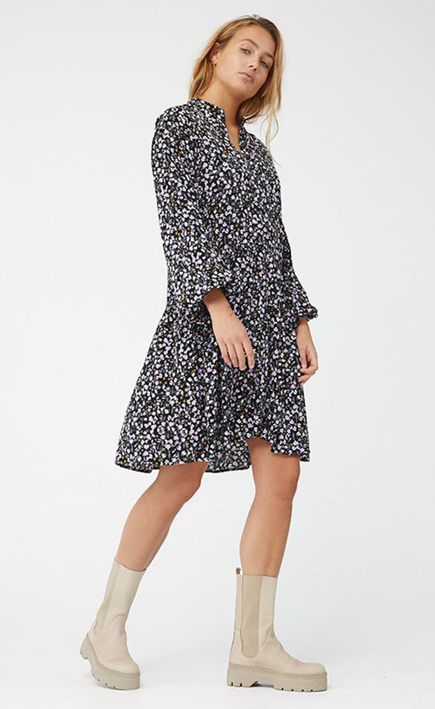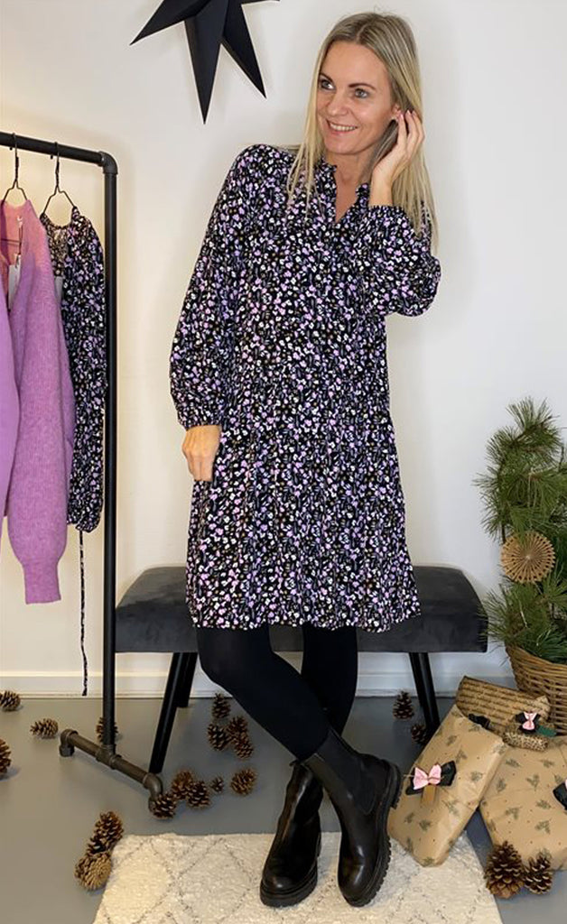 Kjóllinn er svartur í grunninn með fallegu lilla, ljósu, gráu og brúnu munstri.