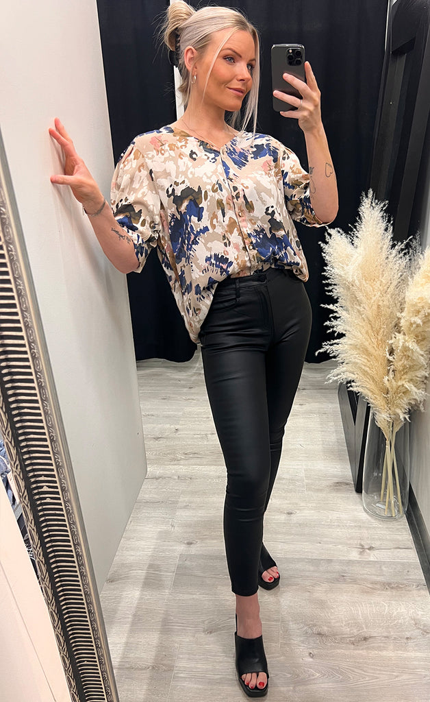 Blússan er hneppt niður og með rykktu detail á öxlum.