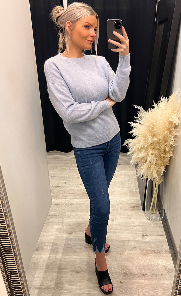 Peysan er úr mjúku og teygjanlegu prjónaefni.