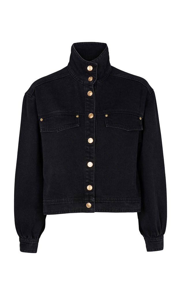 Jakkinn er úr háum kraga og hnepptur niður með gylltum tölum.
