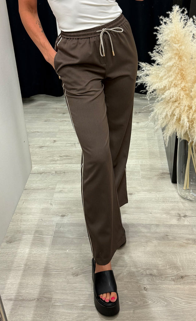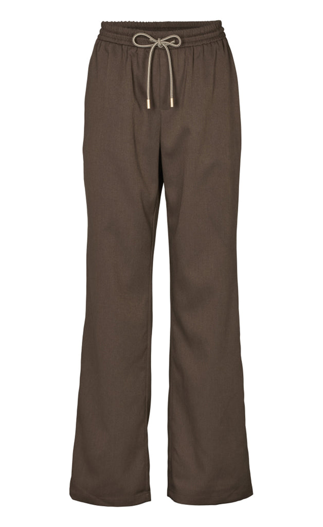 Buxurnar eru með teygju í mittið, með vösum og beinar niður.