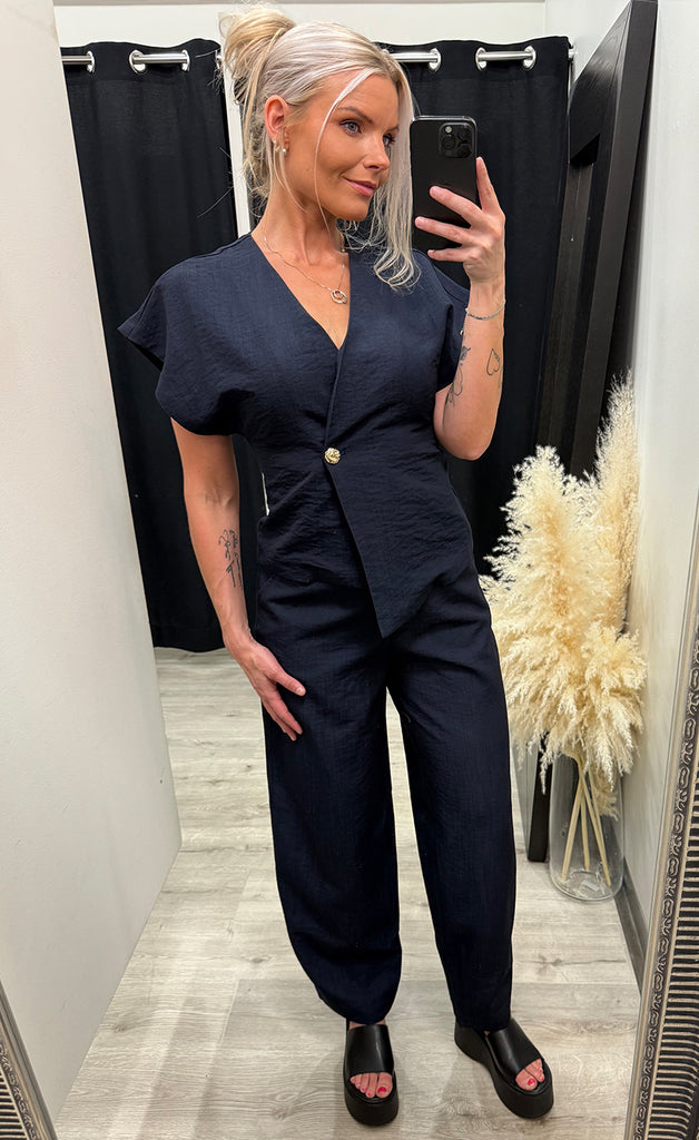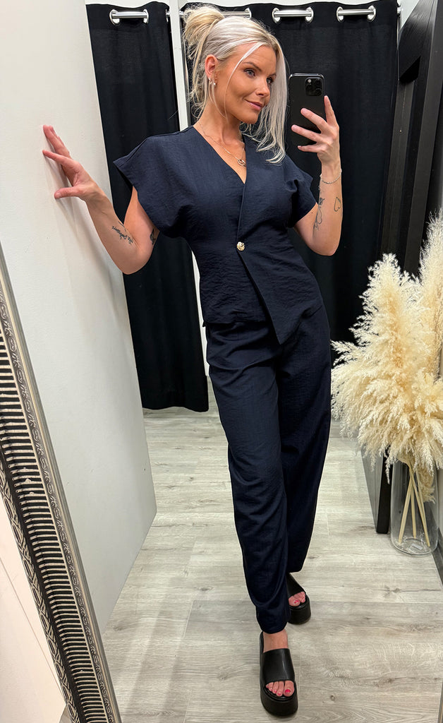 Vestið er úr léttu efni og hneppt með gylltri tölu.