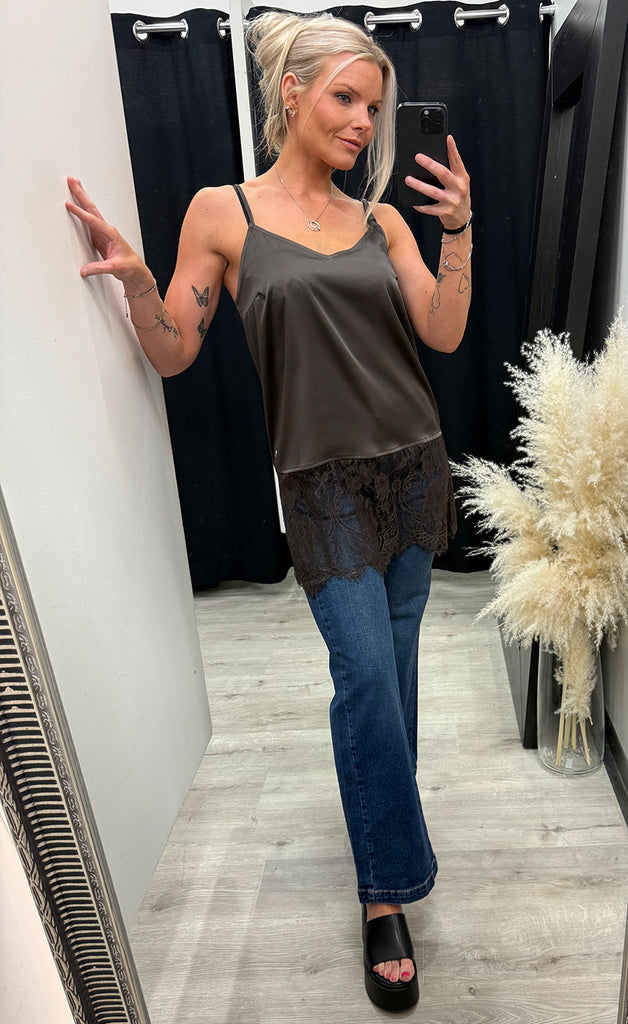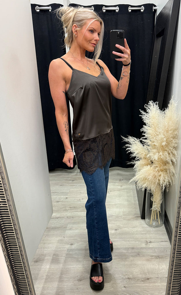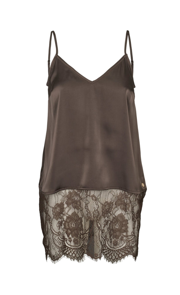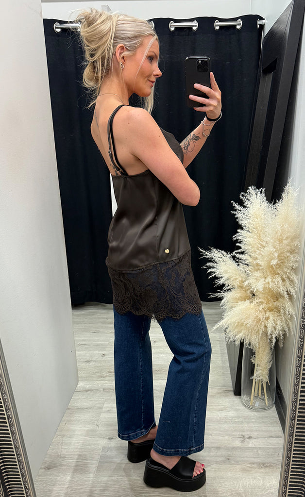 Kjóllinn er úr flottu satín efni og með stillanlegum hlýrum.
