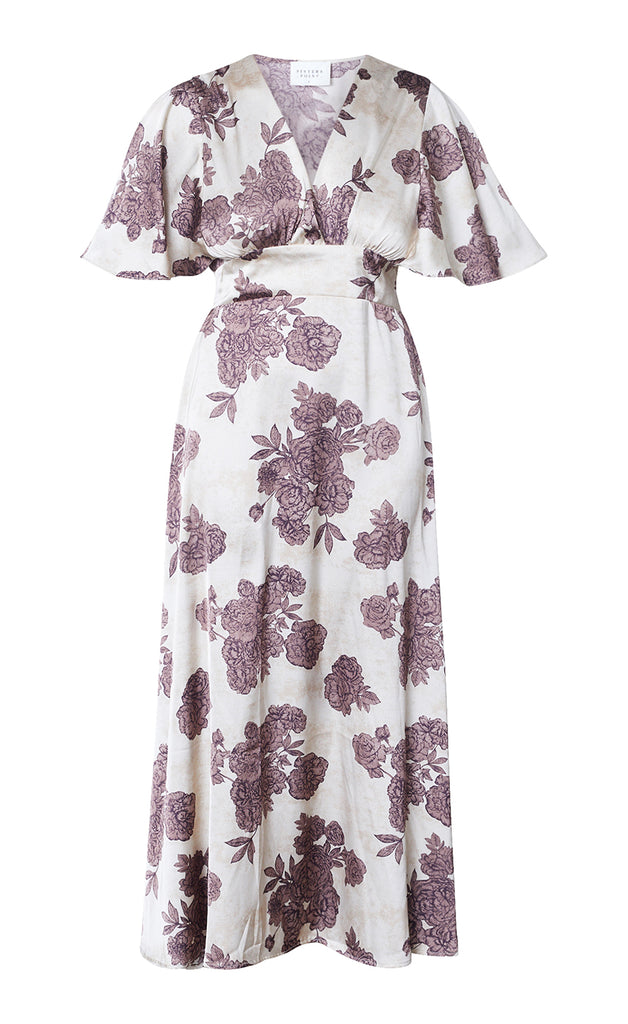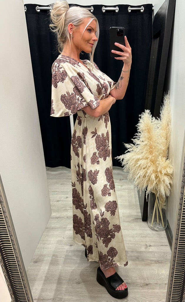 Kjóllinn er úr flottu satín efni, tekinn saman undir brjóst og með teygju í mittið í bakið.