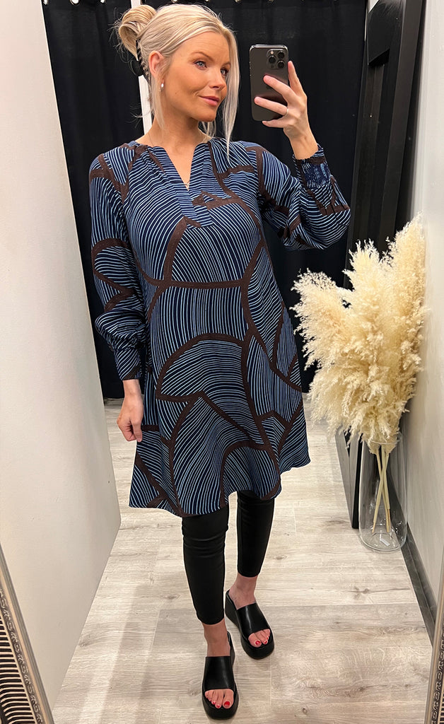 Kjóllinn er með v-hálsmáli, laus í sniði og með teygju framan á ermum.