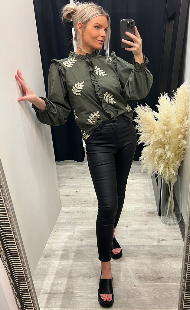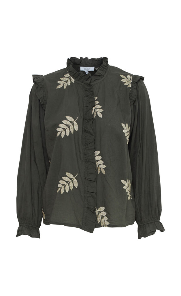 Ótrúlega falleg blússa frá danska merkinu Sorbet. Blússan er úr léttu efni, hneppt niður, með flottu pífu detail og gylltu bróderuðu munstri. -Módel er í stærð S