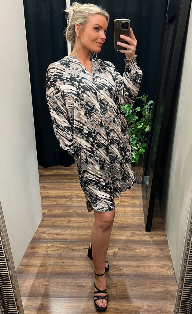 Kjóllinn er úr flottu satín efni, hnepptur niður og með vösum.