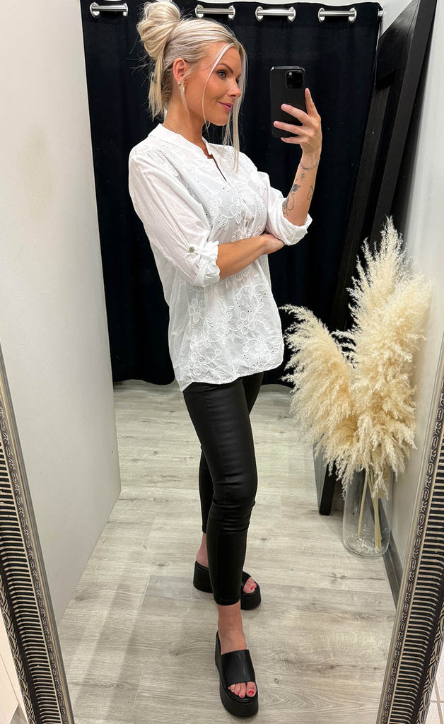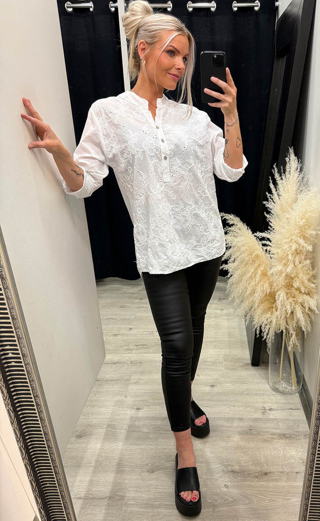 Blússan er hneppt að ofan og með bróderuðu munstri að framan.