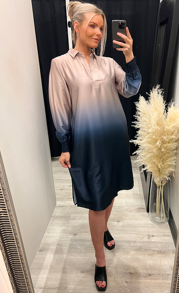Kjóllinn er úr flottu satín efni, með v-hálsmáli og kraga og vösum.
