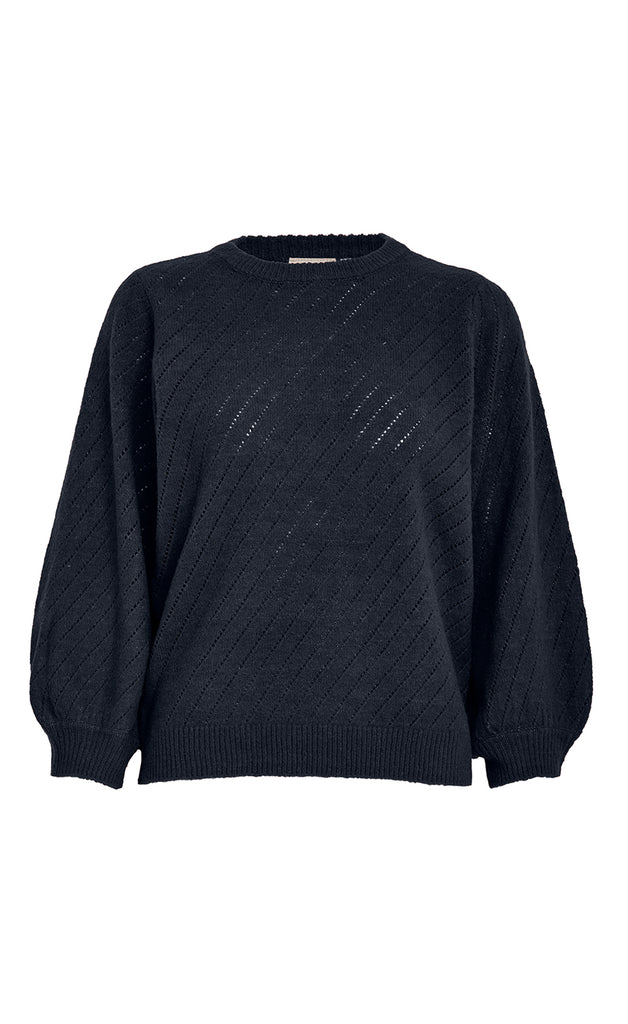 Peysan er úr mjúku og teygjanlegu efni, með flottu gatamunstri og "balloon" ermum.
