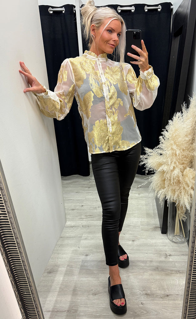 Blússan er úr léttu siffon efni, hneppt niður og með gylltum lurex glansþræði.