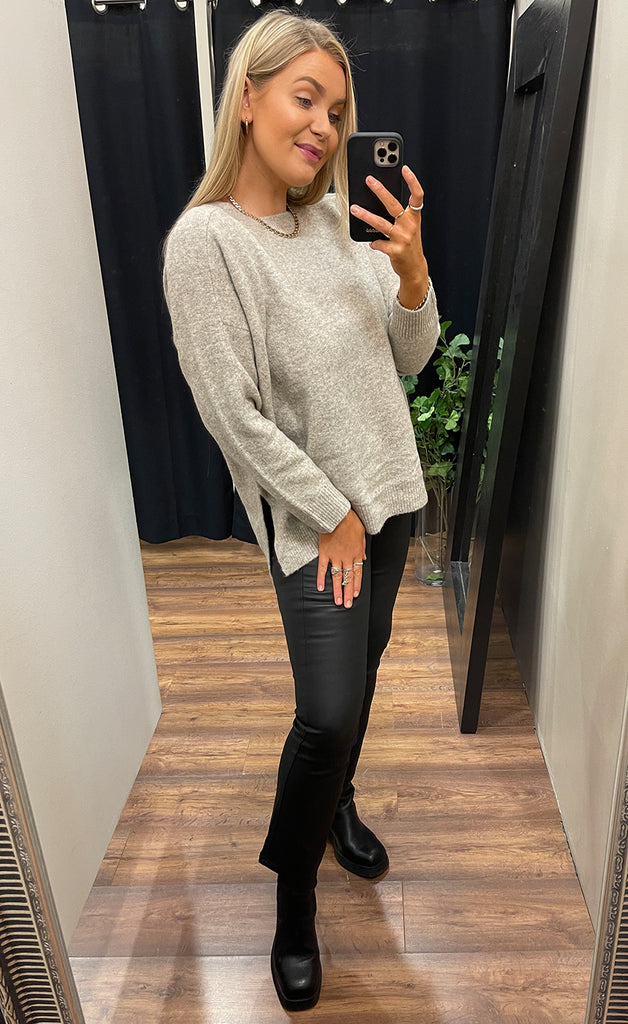 Peysan er úr mjúku prjónaefni, með klauf á hliðum og síðari að aftan.