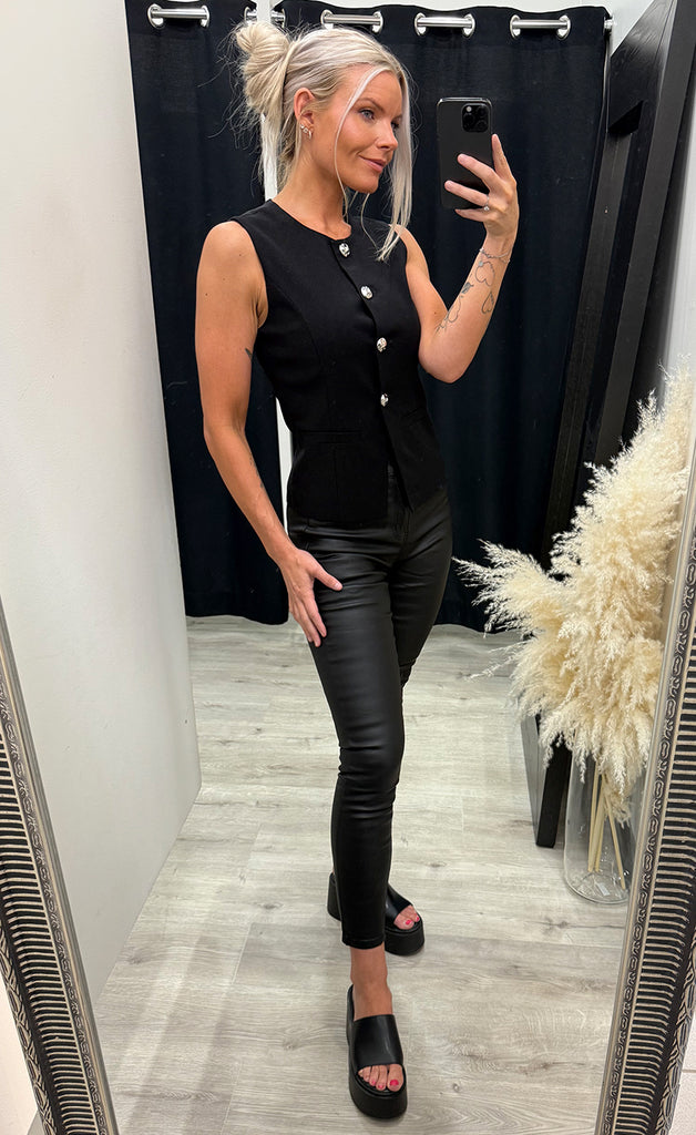 Ótrúlega flott vesti frá danska merkinu Noella.Vestið er hneppt niður með silfur tölum og fóðrað.-Módel notar stærð 36/38 og er 168 cm á hæð og er í stærð SEfni: 63% viscose, 33% polyamide og 4% elastaneFóður: 100% polyester