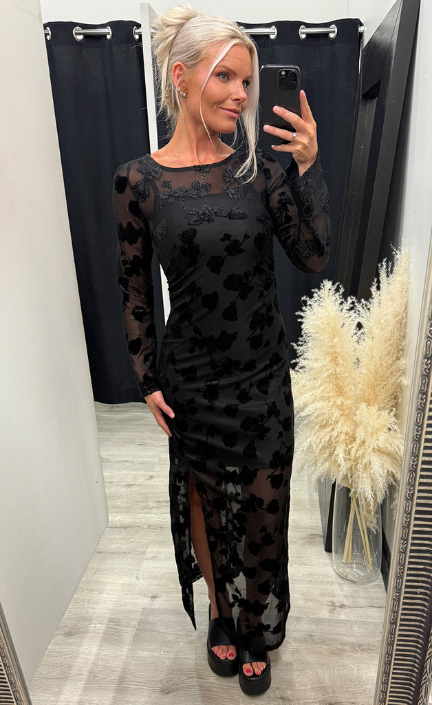 Kjóllinn er úr flottu mesh efni með svörtum lurex glansþræði og renndur í bakið.
