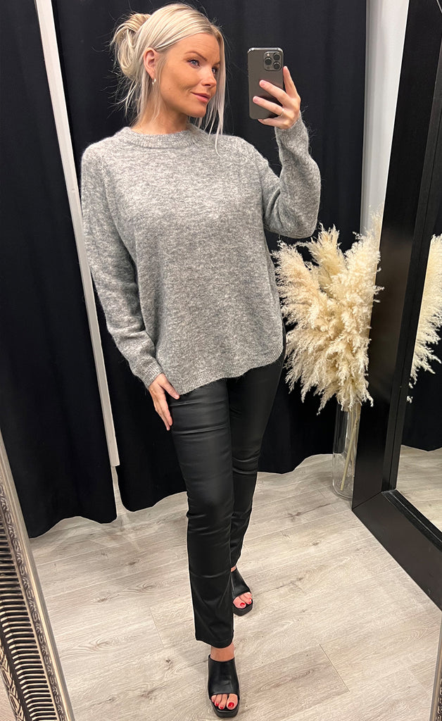 Peysan er úr mjúku og teygjanlegu prjónaefni, rúnuð að neðan og með klauf í hliðum.