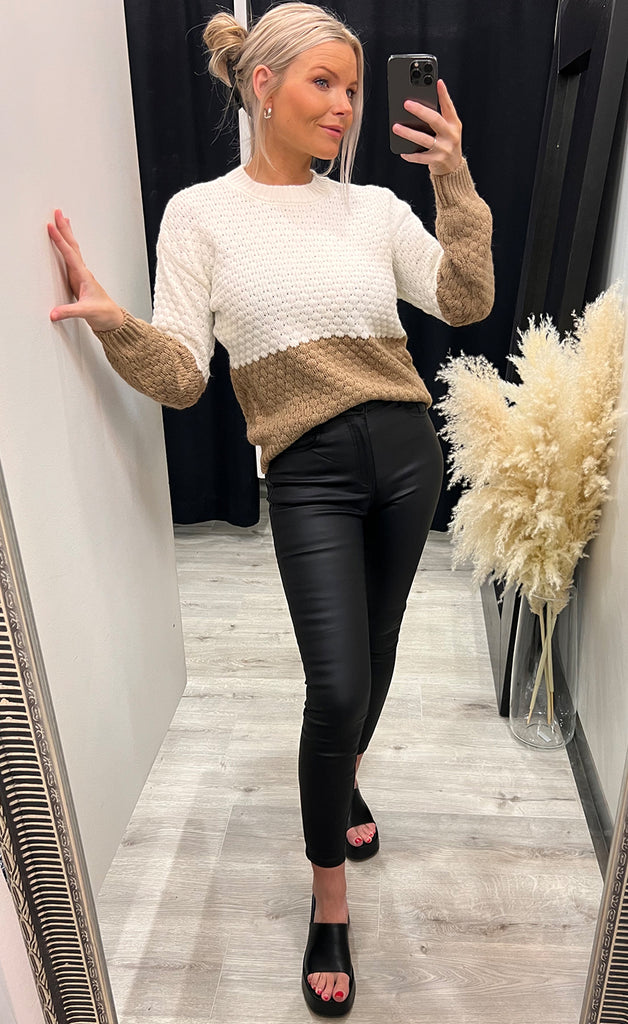 Peysan er úr mjúku og teygjanlegu prjónaefni.