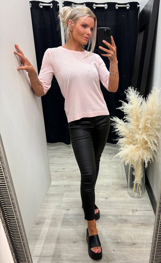 Peysan er úr mjúku og teygjanlegu efni og með flottu gatamunstri.