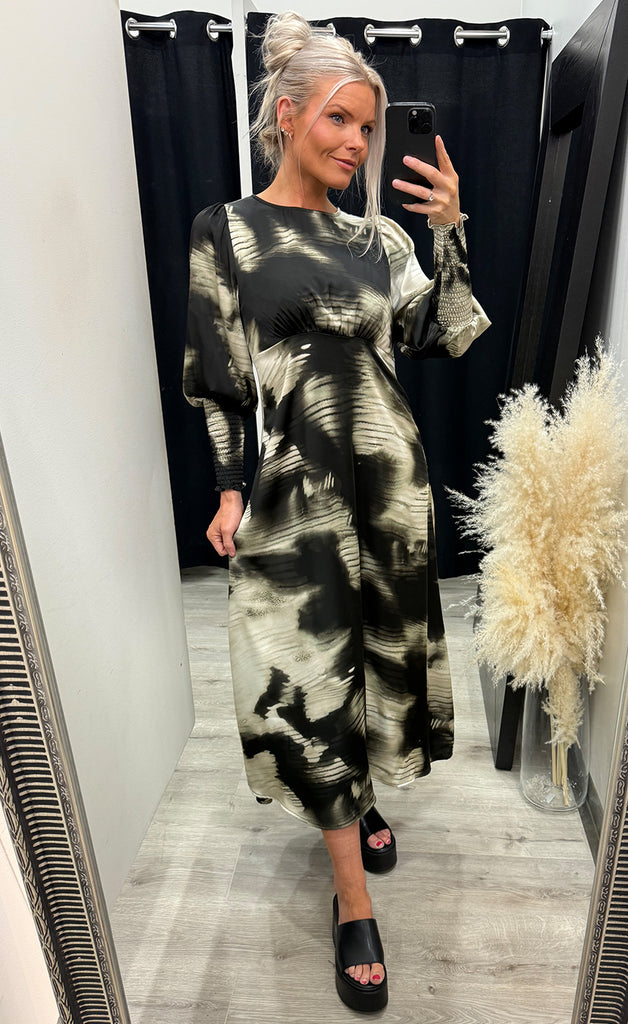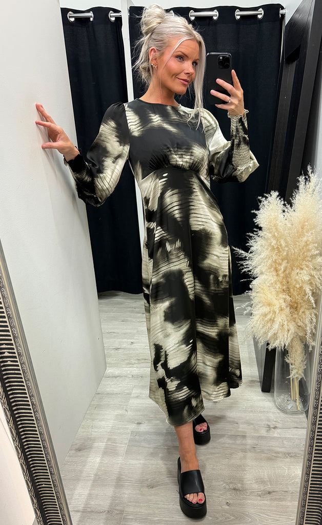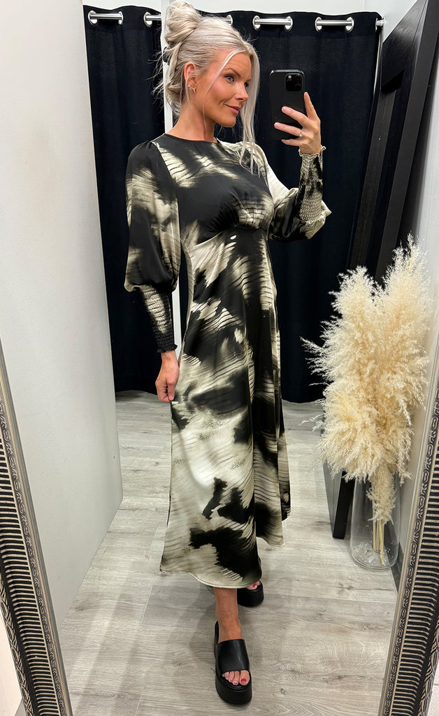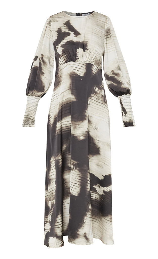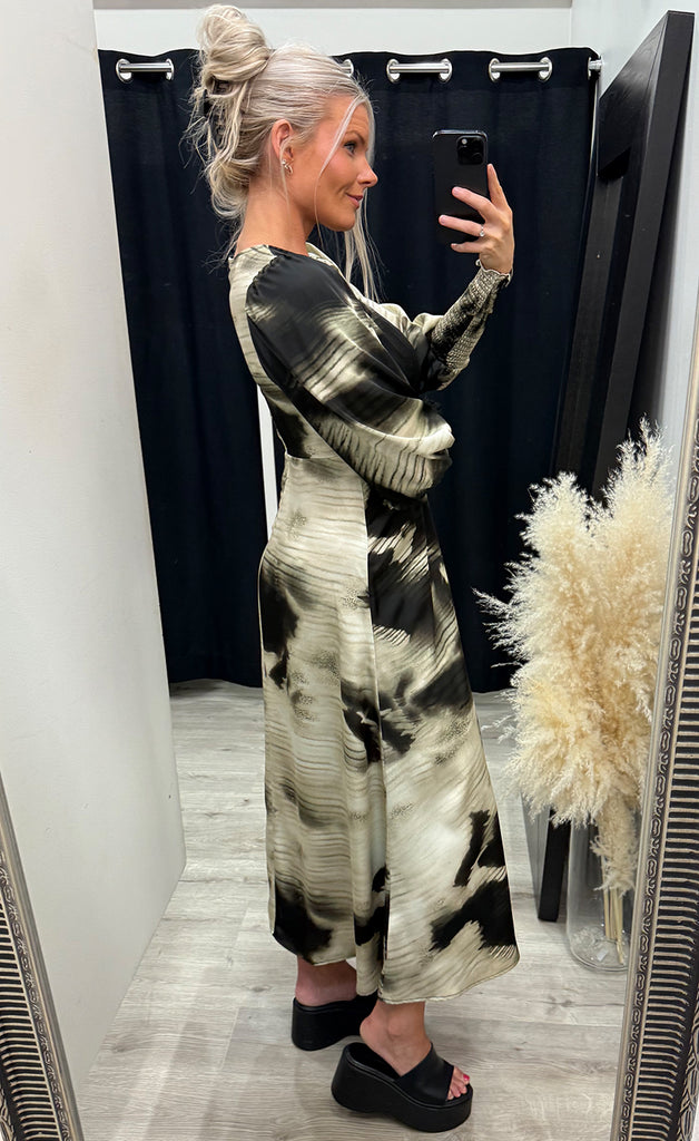Kjóllinn er úr flottu satín efni, tekinn saman undir brjóst og með rennilás í bakið.