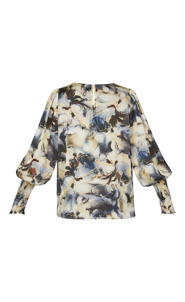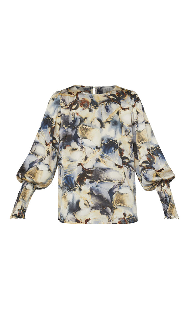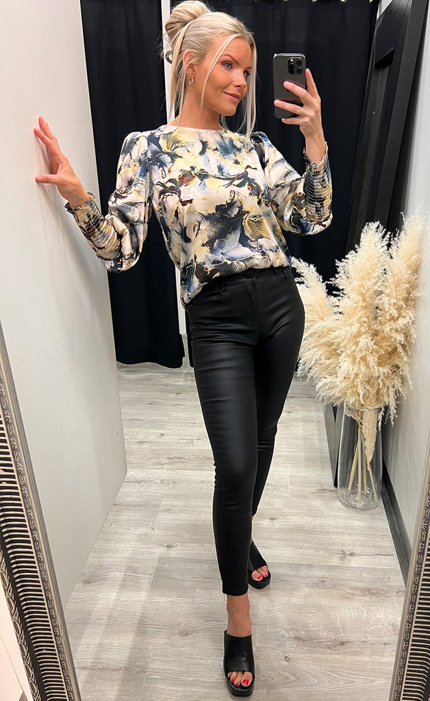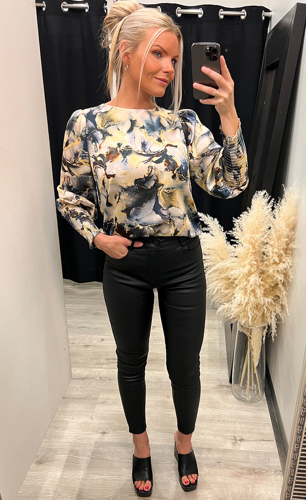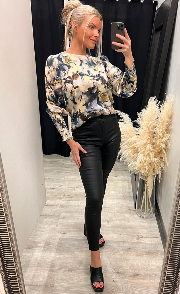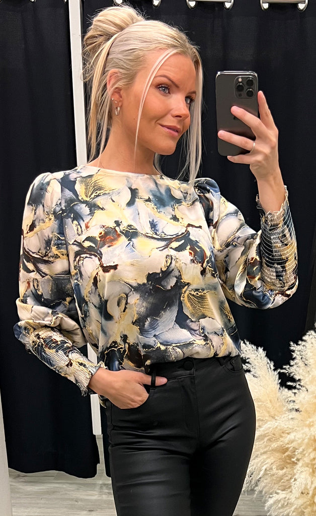 Blússan er úr flottu satín efni og hneppt í bakið.