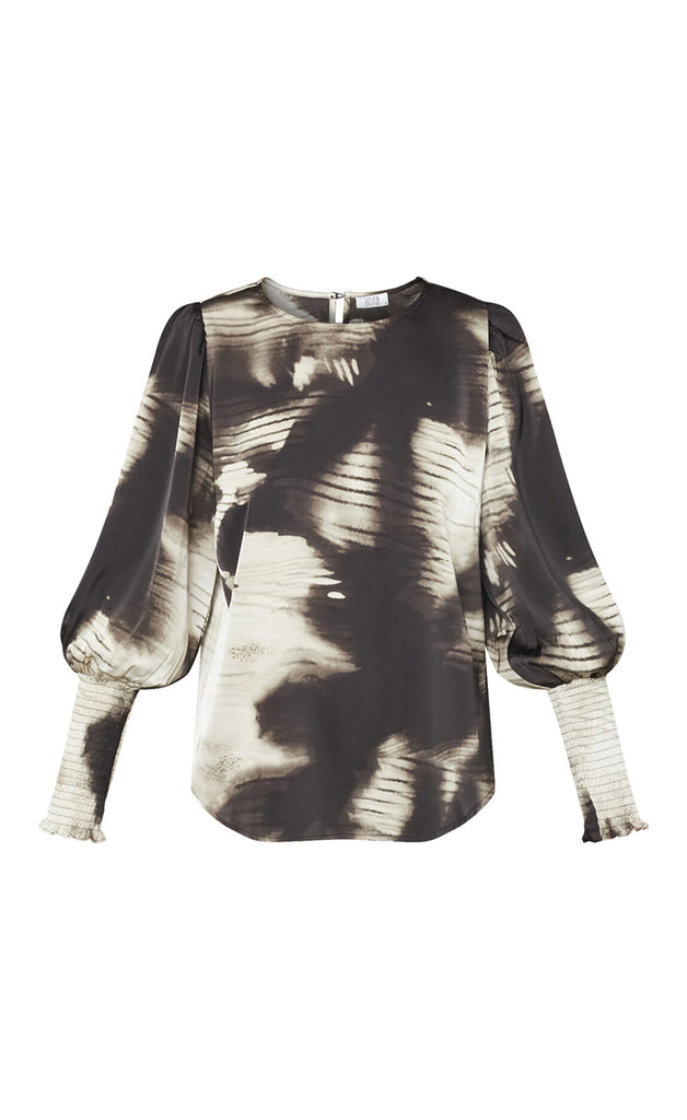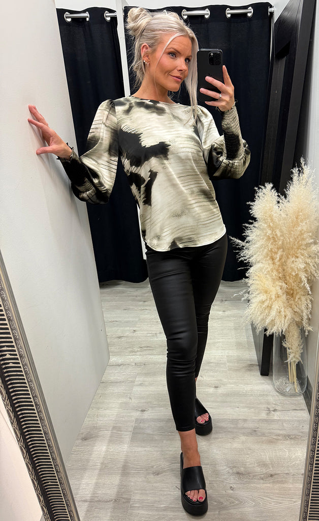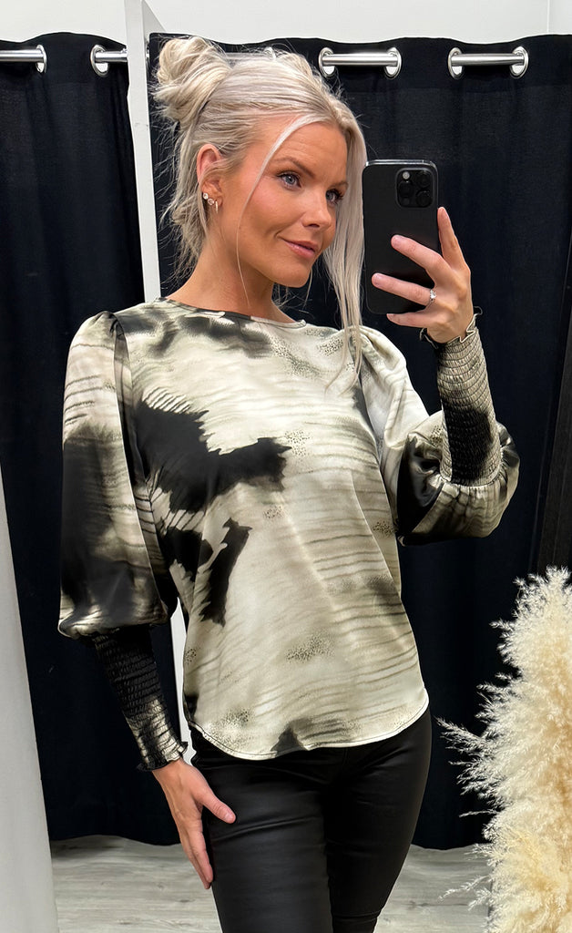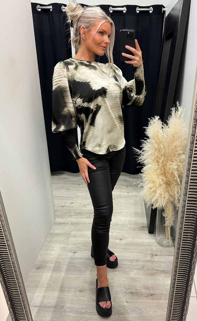 Blússan er úr flottu satín efni og hneppt í bakið.