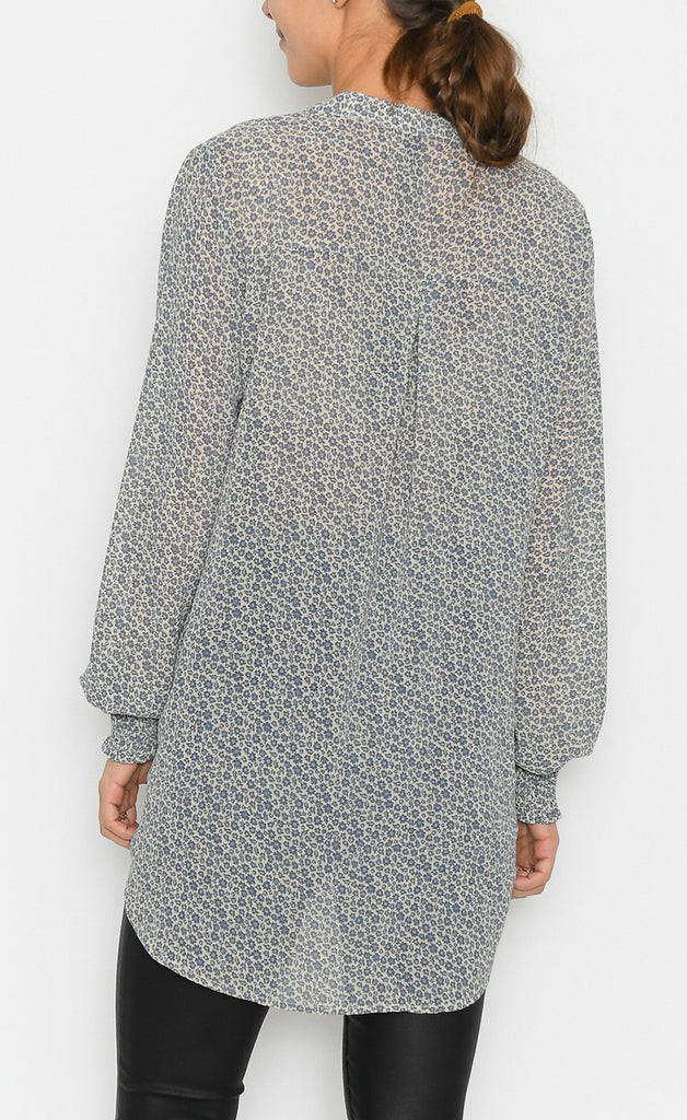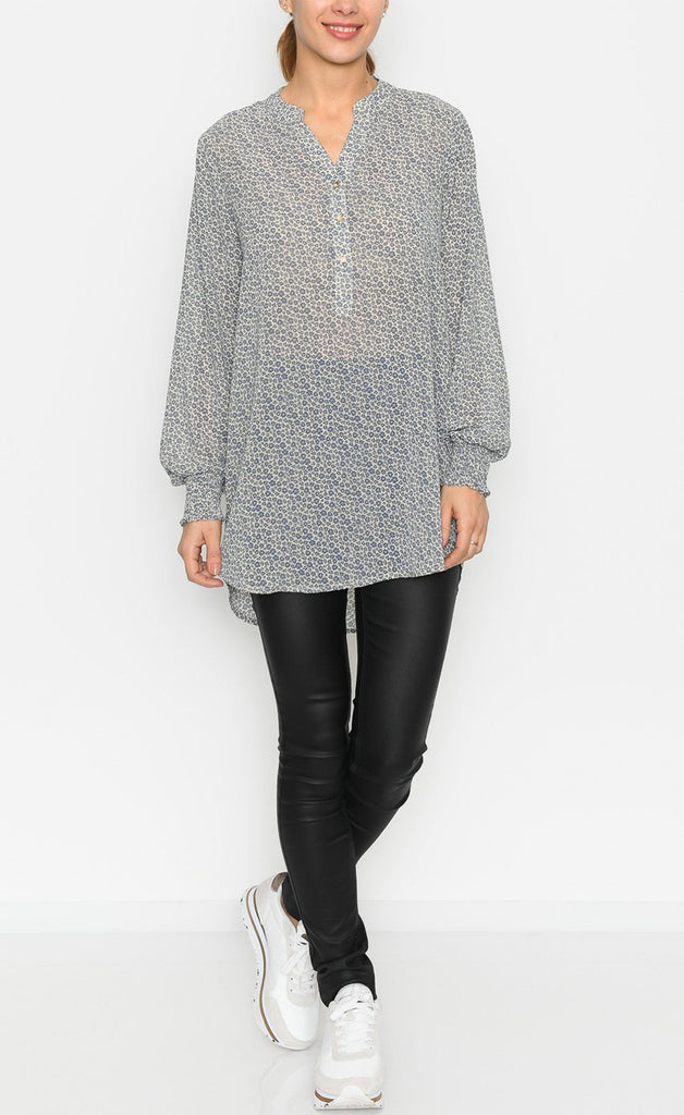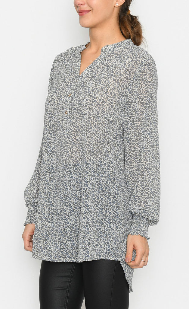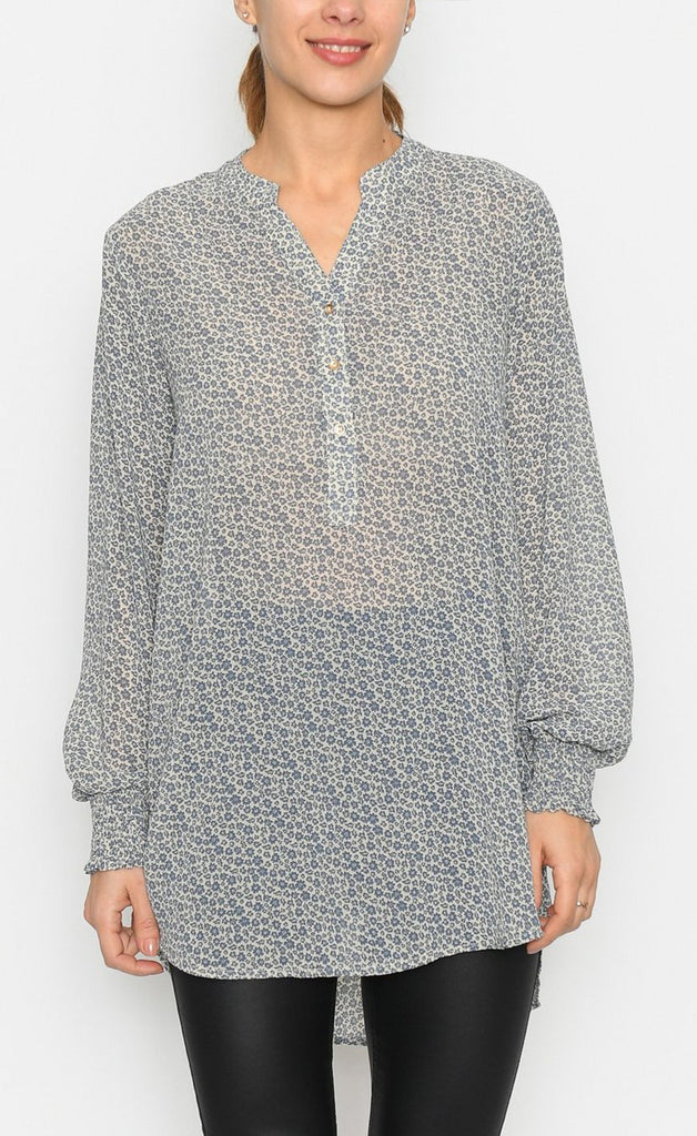 Blússan er hneppt að ofan með v-hálsmáli og teygju á ermum.