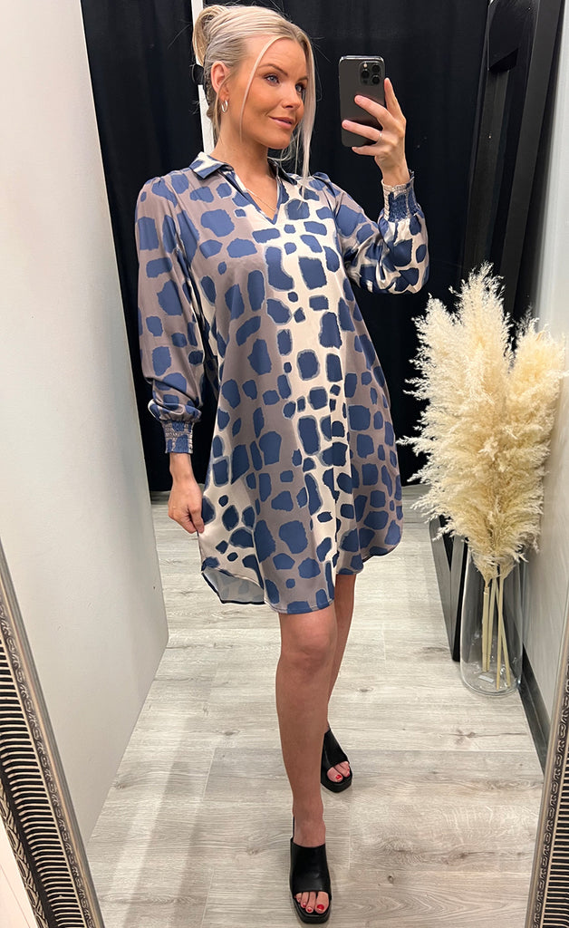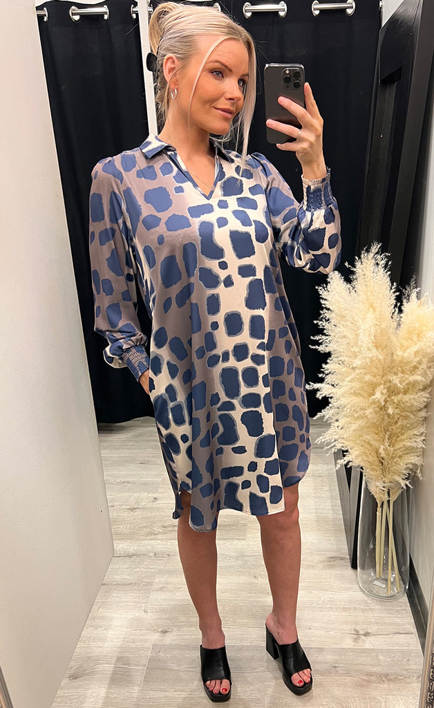 Kjóllinn er úr flottu satín efni, með v-hálsmáli og kraga og með vösum.