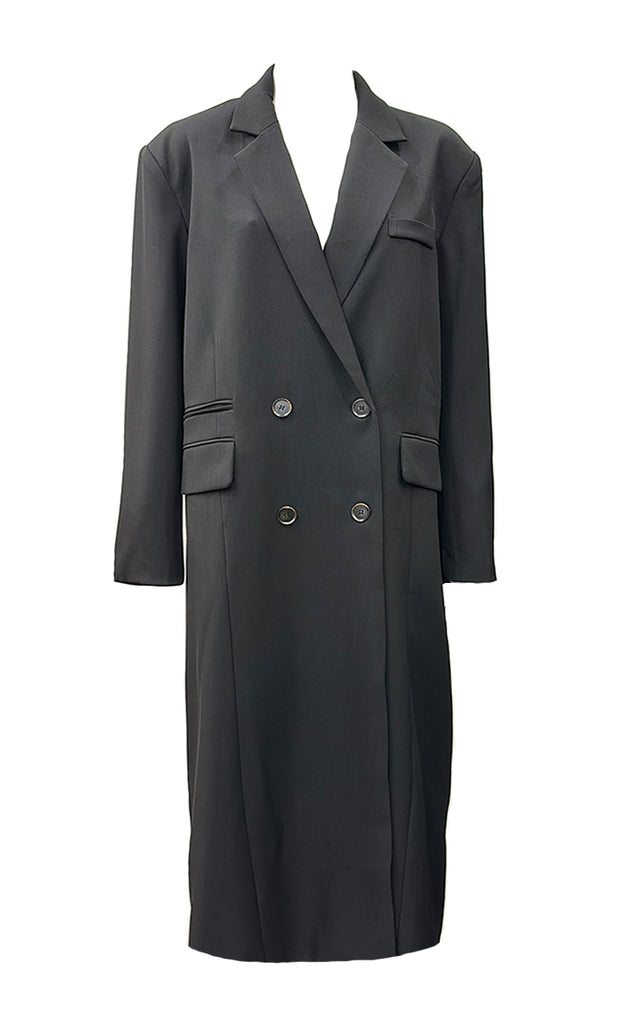 Kápan er víð í sniði, með kraga, hneppt niður og fóðruð.