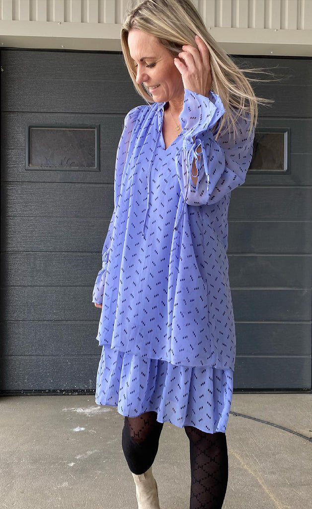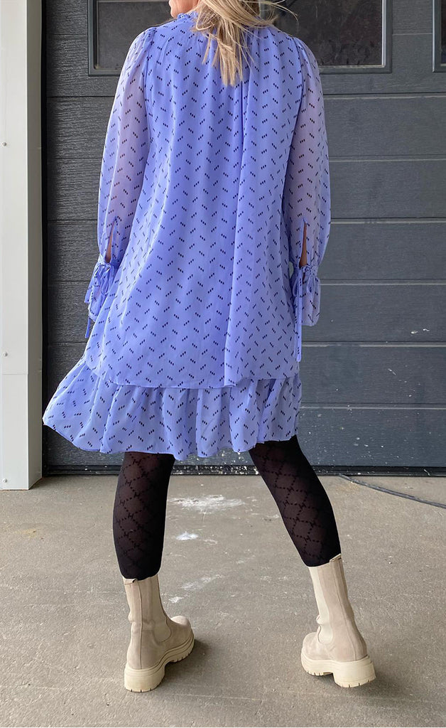 Kjóllinn er laus í sniði og bundinn í hálsinn.