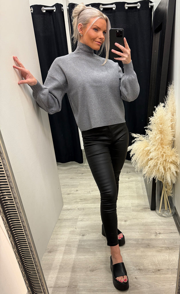 Peysan er úr mjúku og teygjanlegu efni, með háum kraga og oversized í sniði.