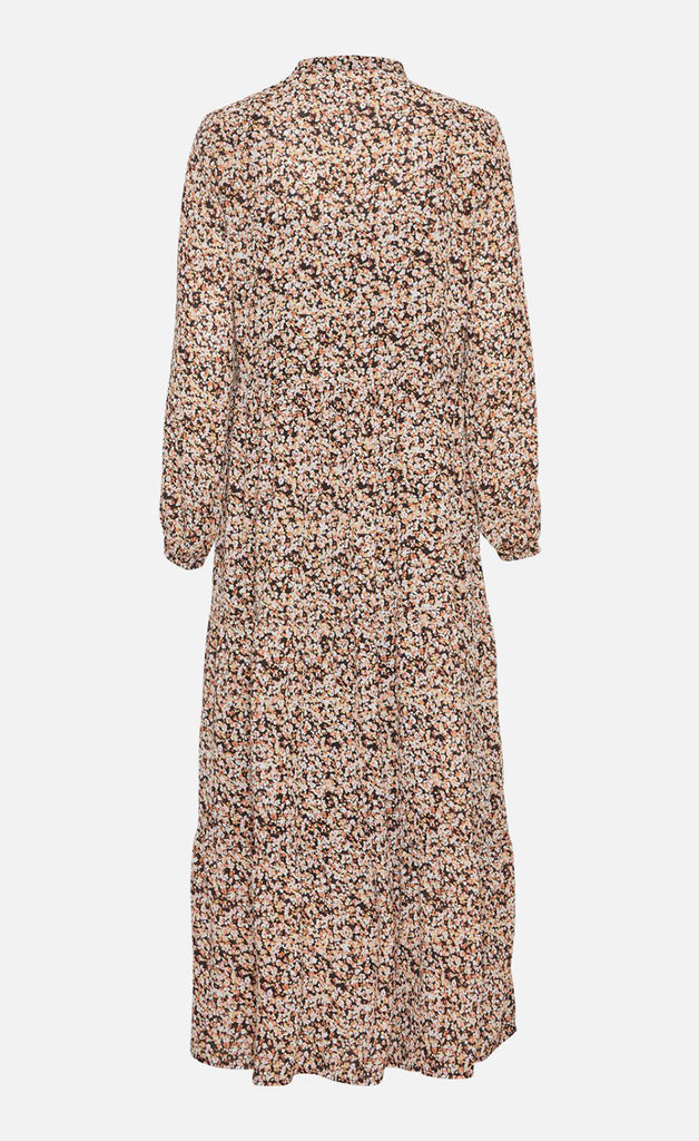 Kjóllinn er hnepptur að ofan og með víðu pilsi.