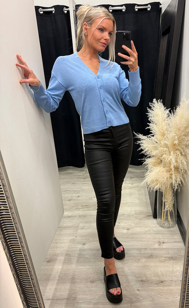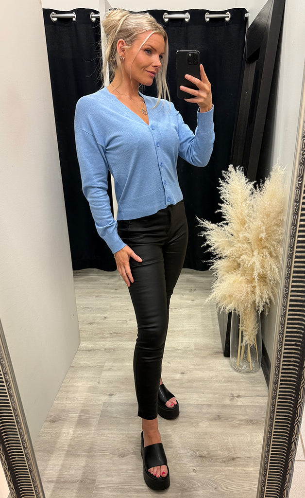 Peysan er úr mjúku og teygjanlegu efni og hneppt niður.