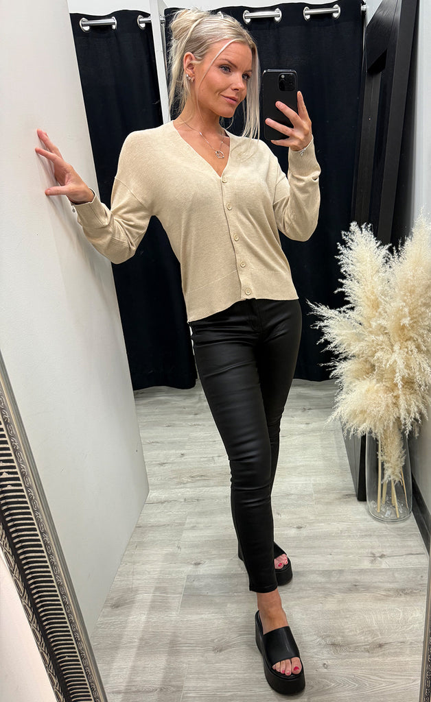 Peysan er úr mjúku og teygjanlegu efni og hneppt niður.