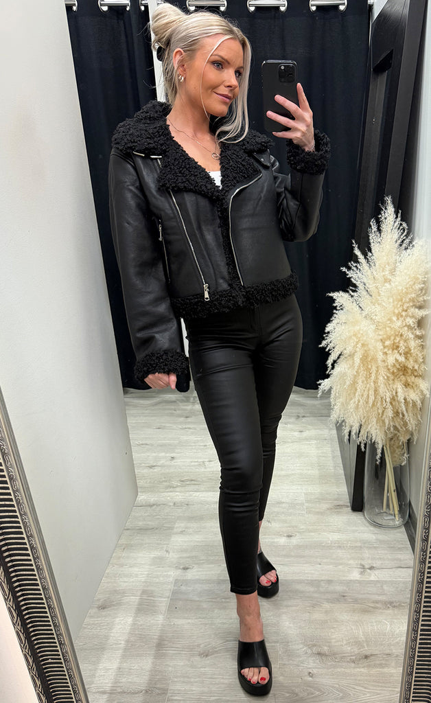 Ótrúlega flottur loðfóðraður pleðurjakki. Jakkinn er með kraga, renndur niður og með vösum. -Módel notar stærð 36/38 og er 168 cm á hæð og er í stærð S