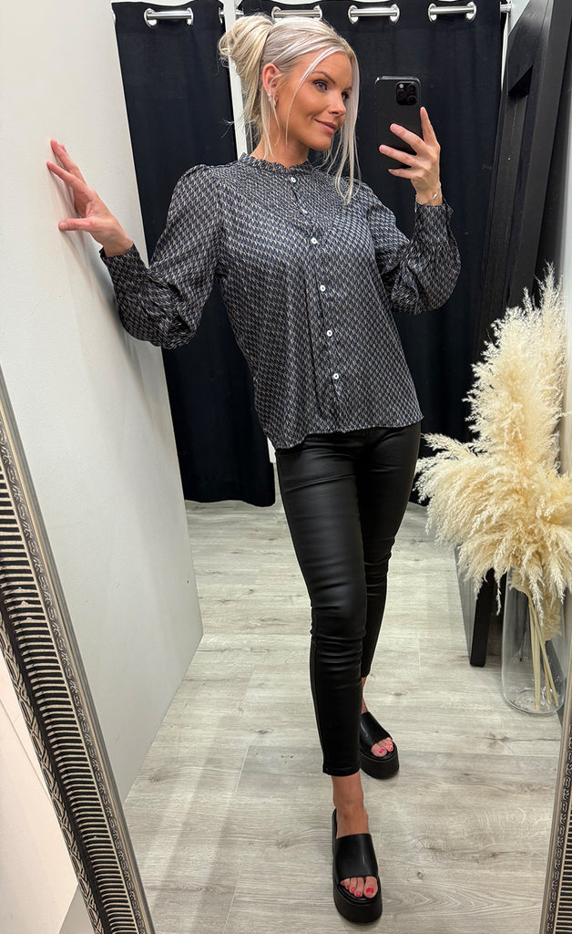 Blússan er úr flottu satín efni, laus í sniði og hneppt niður.