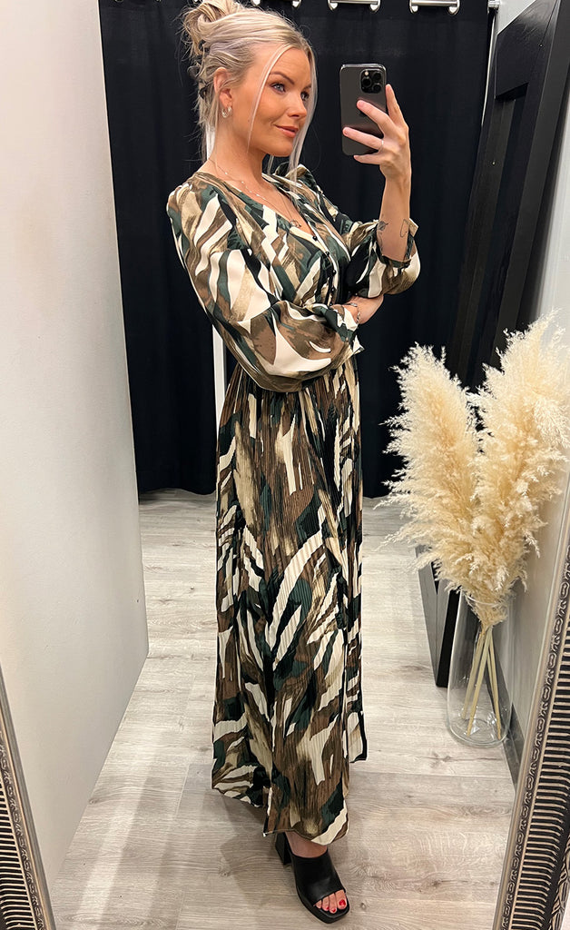 Kjóllinn er hnepptur að ofan, með teygju undir brjóst og með plíseruðu víðu pilsi.
