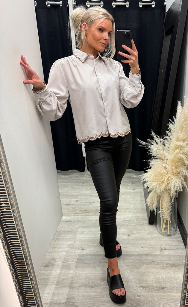 Skyrtan er úr léttu efni, með kraga, hneppt niður, víð í sniði og með flottu bróderuðu detail á kraga og að neðan.