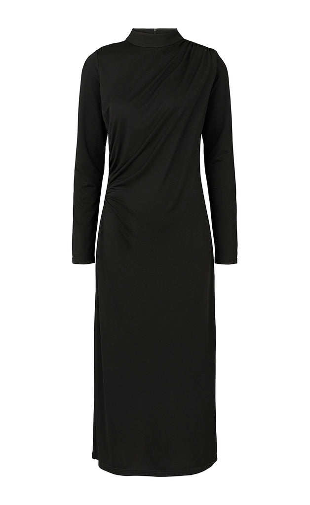 Kjóllinn er úr mjúku og teygjanlegu efni, með háum kraga, með rykktu detail í hliðum og rennilás í bakið.