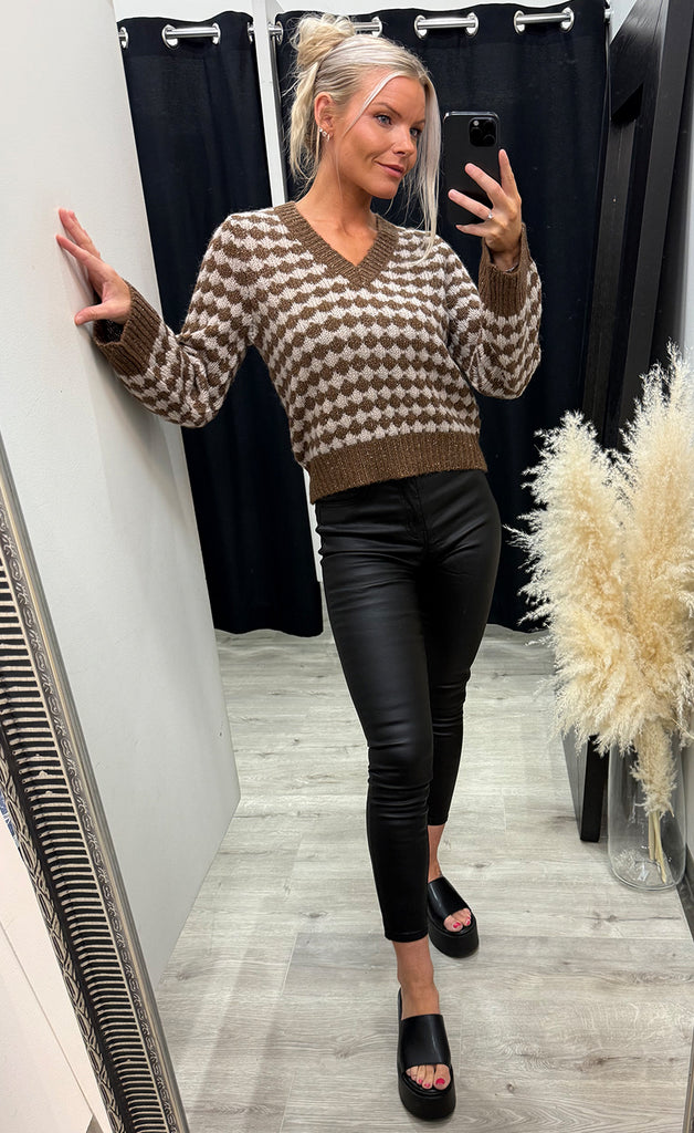 Peysan er úr mjúku og teygjanlegu efni og með gylltum lurex glansþræði.