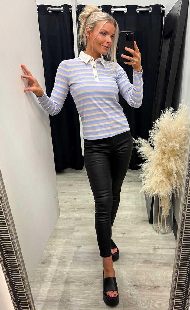 Bolurinn er úr mjúku og teygjanlegu efni, með kraga og hnepptur að ofan með gylltum tölum.