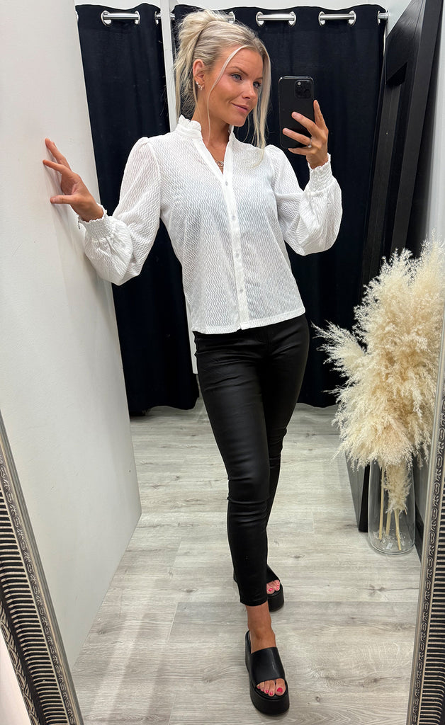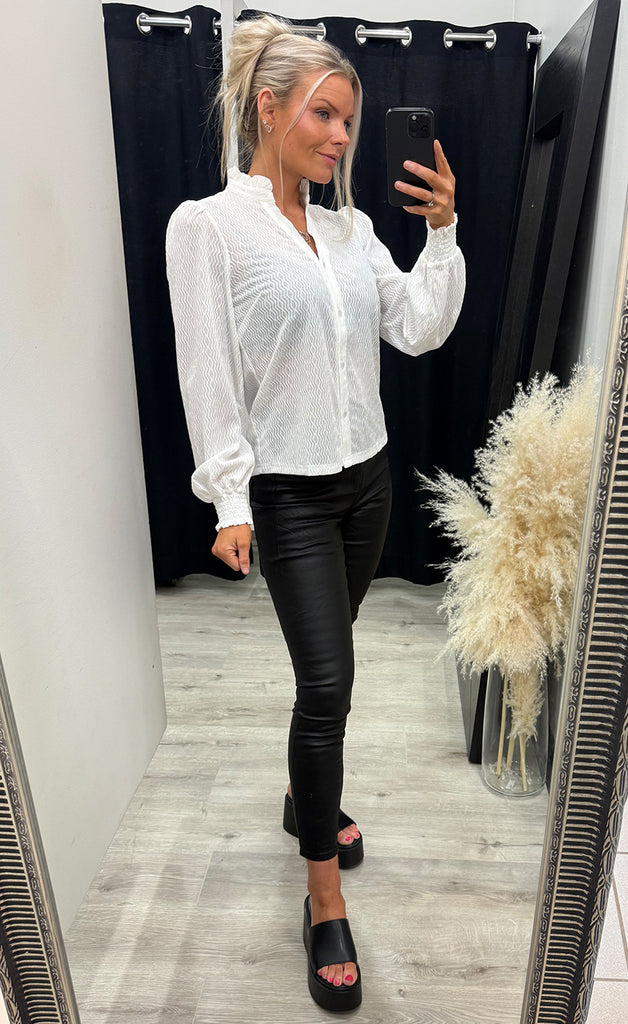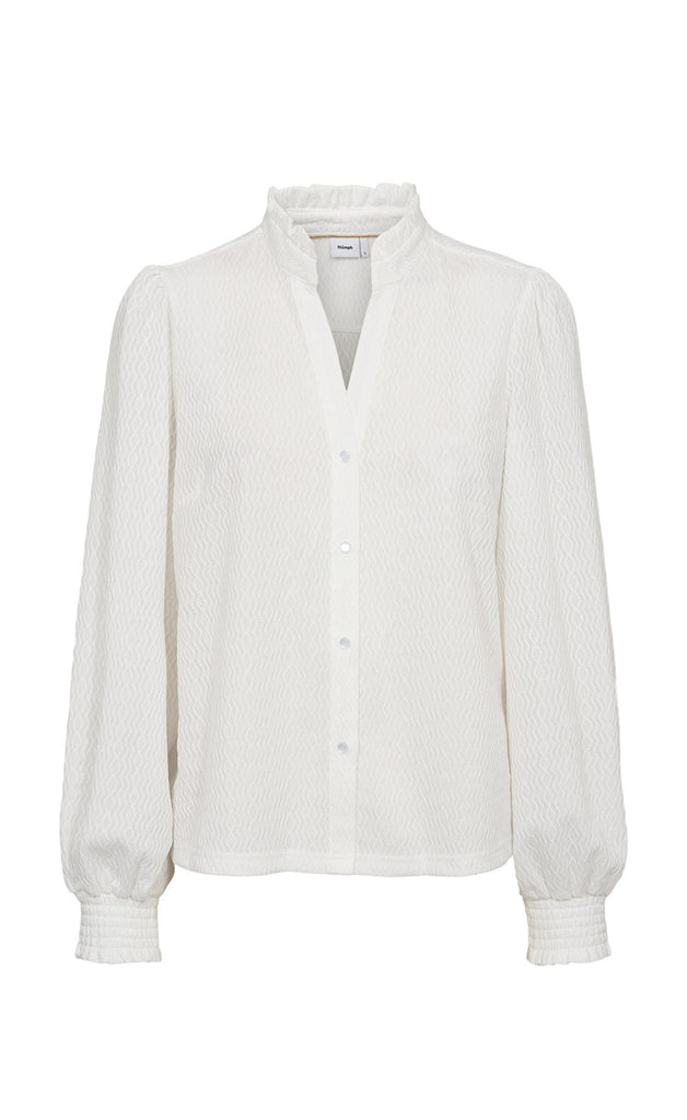 Ótrúlega falleg blússa frá danska merkinu Nümph. Blússan er úr mjúku og teygjanlegu efni og hneppt niður. -Módel notar stærð 36/38 og er 168 cm á hæð og er í stærð XS