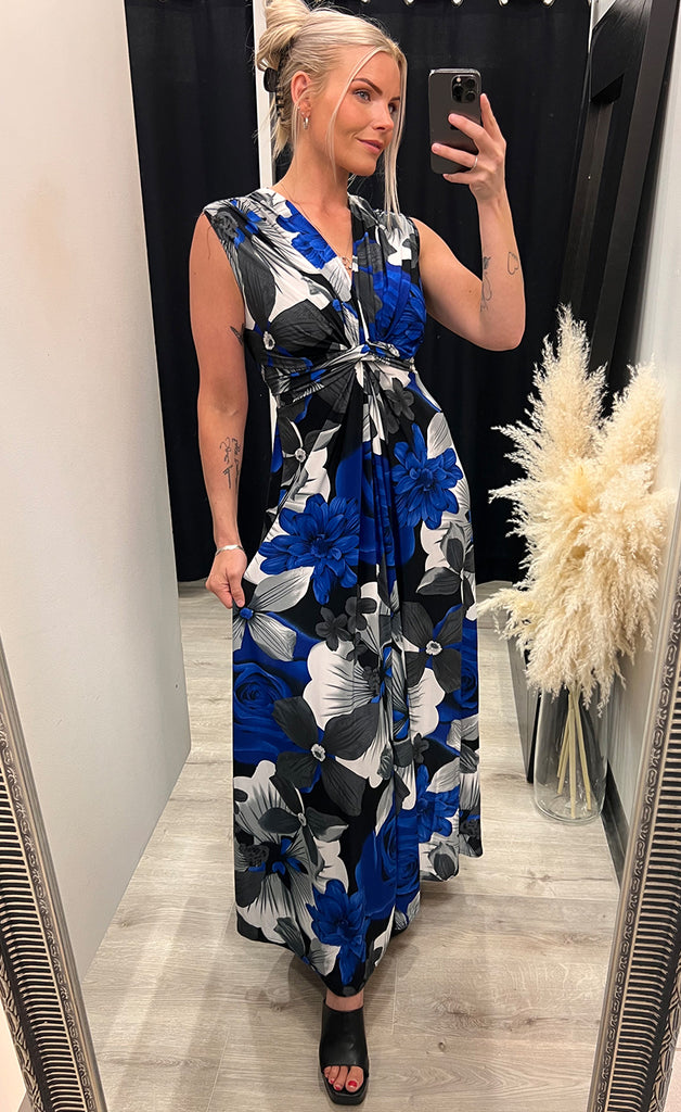 Kjóllinn er með skiptingu undir brjóst, með víðu pilsi og bundinn að aftan.
