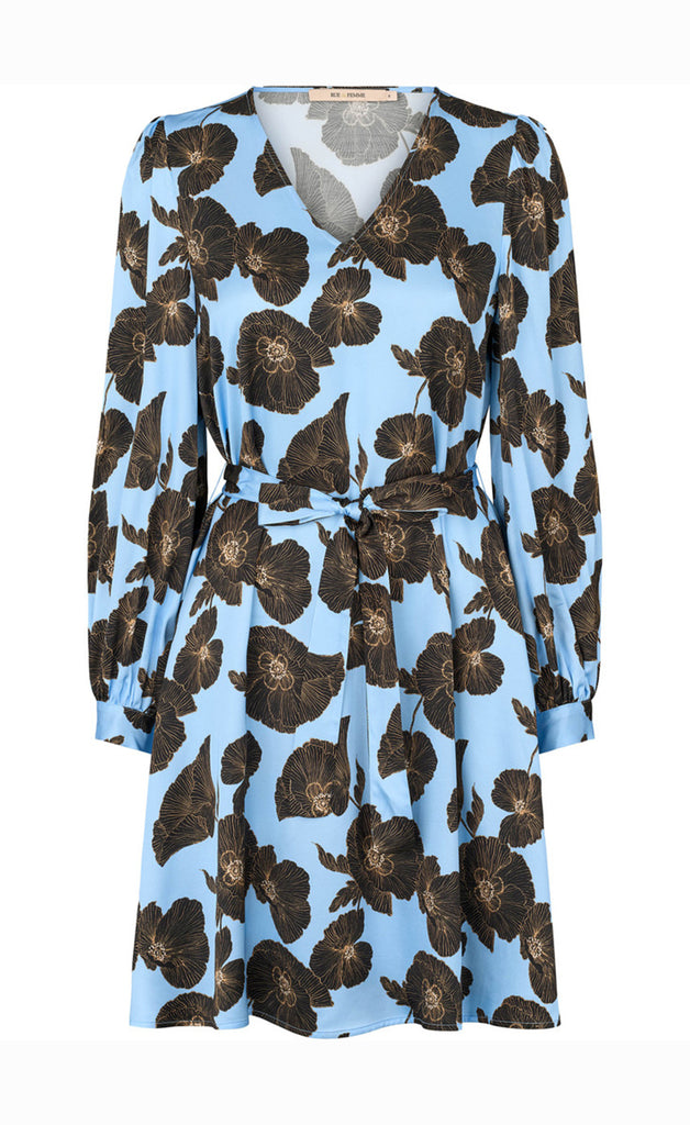Kjóllinn er úr flottu satín efni og hægt að taka saman í mittið með bandi.
