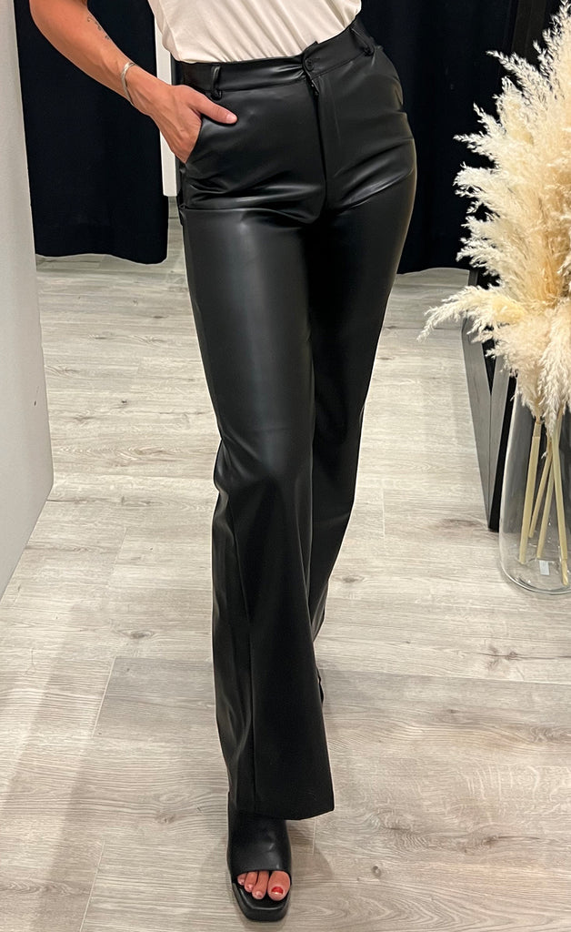 Geggjaðar pleðurbuxur úr mjúku og teygjanlegu efni.-Módel notar stærð 36/38 og er 168 cm á hæð og er í stærð SEfni: 55% polyester og 45% PU