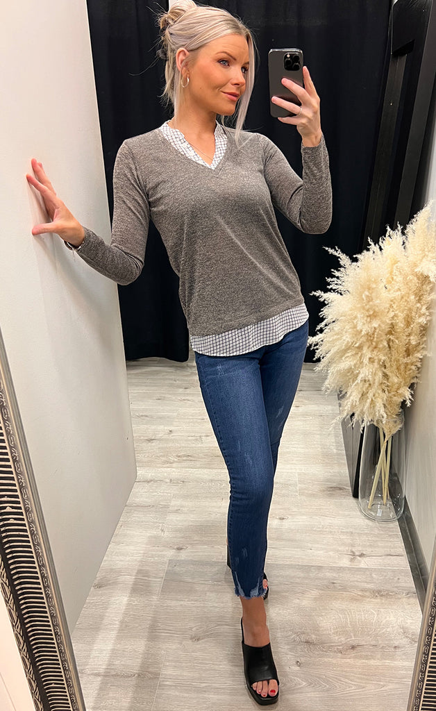 Peysan er úr mjúku prjónaefni og með fastri skyrtu innanundir.