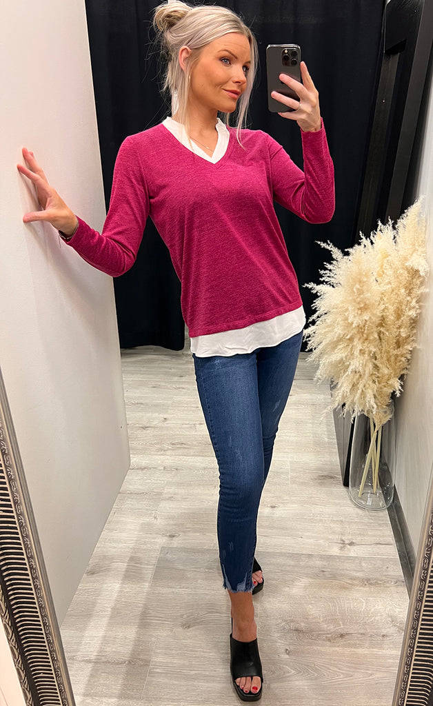 Peysan er úr mjúku prjónaefni og með fastri skyrtu innanundir.