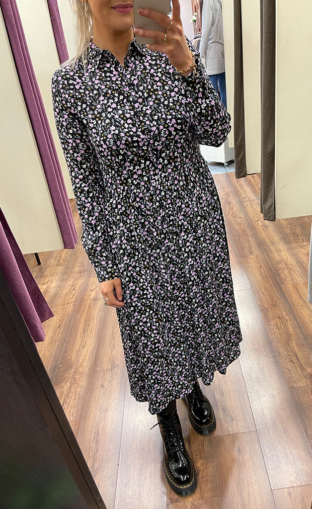 Kjóllinn er hnepptur að ofan, með kraga, víðu pilsi og klauf á hliðum.